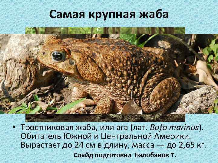 Самая крупная жаба • Тростниковая жаба, или ага (лат. Bufo marinus). Обитатель Южной и Центральной Америки. Вырастает до 24 см в длину, масса — до 2, 65 кг. Слайд подготовил Балобанов Т.
