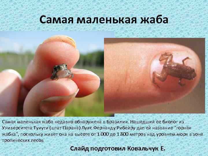 Самая маленькая жаба недавно обнаружена в Бразилии. Нашедший ее биолог из Университета Туиути (штат Парана) Луис Фернанду Рибейру дал ей название "горная жабка", поскольку живет она на высоте от 1 000 до 1 800 метров над уровнем моря в зоне тропических лесов Слайд подготовил Ковальчук Е.