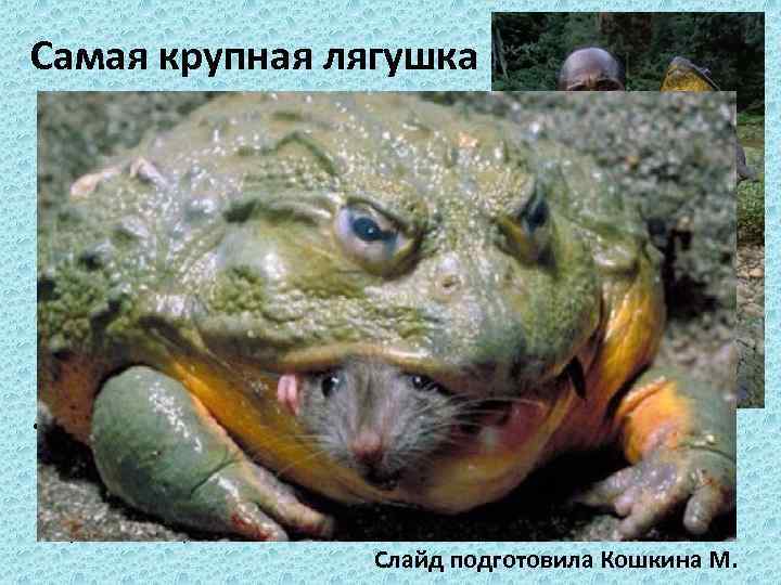 Самая крупная лягушка • Лягушка-голиаф — земноводное из семейства настоящих лягушек, крупнейшая из современных лягушек. Обитает в юго-западном Камеруне и Экваториальной Гвинее Длина тела лягушки-голиаф (не учитывая задние лапы) может достигать 32 см, а вес — до 3, 250 кг, обитает в водопадах , быстрых и полноводных тропических реках Слайд подготовила Кошкина М.