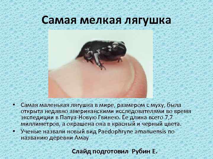Самая мелкая лягушка • Самая маленькая лягушка в мире, размером с муху, была открыта недавно американскими исследователями во время экспедиции в Папуа-Новую Гвинею. Ее длина всего 7, 7 миллиметров, а окрашена она в красный и черный цвета. • Ученые назвали новый вид Paedophryne amanuensis по названию деревни Амау Слайд подготовил Рубин Е.