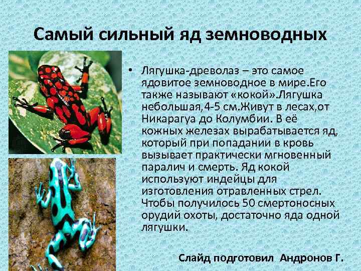 Самый сильный яд земноводных • Лягушка-древолаз – это самое ядовитое земноводное в мире. Его также называют «кокой» . Лягушка небольшая, 4 -5 см. Живут в лесах, от Никарагуа до Колумбии. В её кожных железах вырабатывается яд, который при попадании в кровь вызывает практически мгновенный паралич и смерть. Яд кокой используют индейцы для изготовления отравленных стрел. Чтобы получилось 50 смертоносных орудий охоты, достаточно яда одной лягушки. Слайд подготовил Андронов Г.
