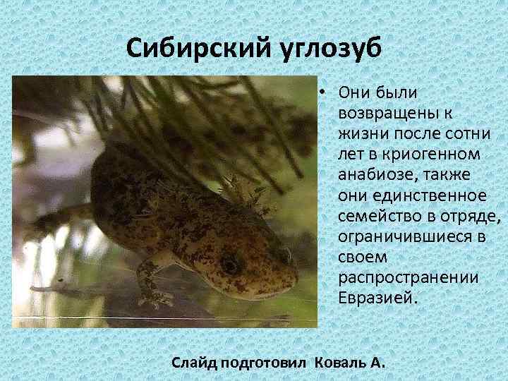 Сибирский углозуб • Они были возвращены к жизни после сотни лет в криогенном анабиозе, также они единственное семейство в отряде, ограничившиеся в своем распространении Евразией. Слайд подготовил Коваль А.