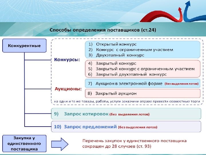 Способы закупок Открытый конкурс -сокращен срок подачи заявок с 30 до 20 Основная процедура, соответствует мировой практике, дней, преемственность по отношению -прописана возможность привлечения экспертов для оценки документации, заявок, к процедуре по 94 -ФЗ - рассмотрение и оценка объединены в один этап, -если конкурс не состоялся, проводится повторный, при этом Н(М)Ц может быть увеличена на 10%, если повторный не состоялся – запрос предложений
