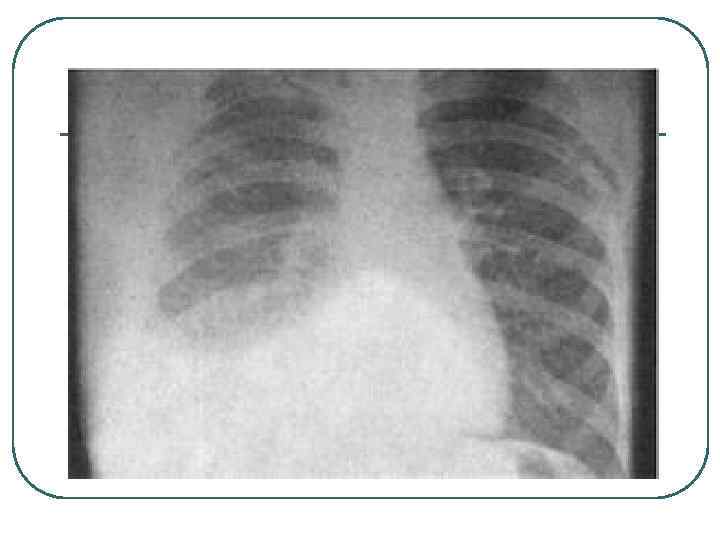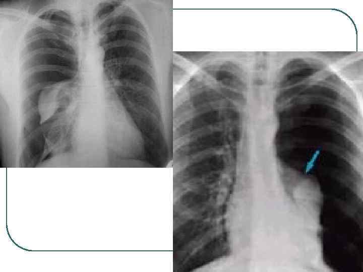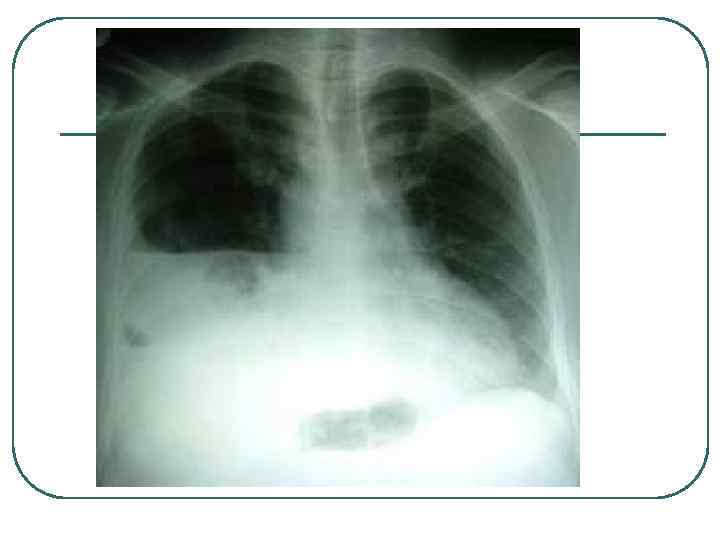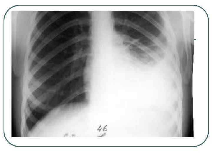Анамнез: картина фонового заболевания легких, можно выявить предыдущие эпизоды развития ПТ (рецидивирующий ПТ). Объективно: l состояние средней тяжести или тяжелое, l асимметрия грудной клетки, связанная с выбуханием пораженной половины l ослабление голосового дрожания l тимпанит на стороне поражения l отсутствие или резкое ослабление дыхания l симптомы острого легочного сердца R: скопление воздуха в полости плевры, коллабирование легочной ткани, смещение средостения в здоровую сторону. Лечебная тактика: l Наблюдение при незначительном ПТ, экстренная плевральная пункция и дренирование при выраженном ПТ. l Лечение основного заболевания.