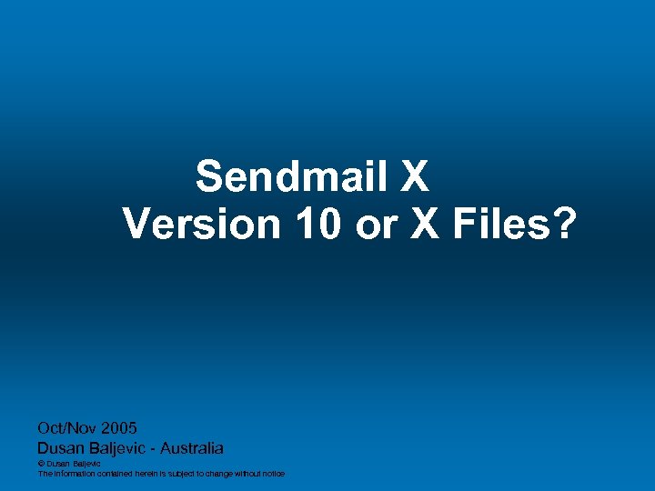 Sendmail X Version 10 or X Files? Oct/Nov 2005 Dusan Baljevic - Australia © Dusan Baljevic The information contained herein is subject to change without notice