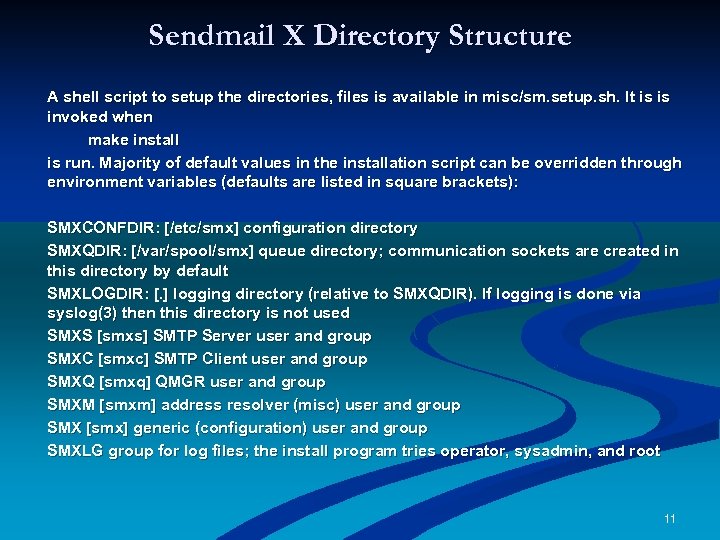 Sendmail X Directory Structure A shell script to setup the directories, files is available in misc/sm. setup. sh. It is is invoked when make install is run. Majority of default values in the installation script can be overridden through environment variables (defaults are listed in square brackets): SMXCONFDIR: [/etc/smx] configuration directory SMXQDIR: [/var/spool/smx] queue directory; communication sockets are created in this directory by default SMXLOGDIR: [. ] logging directory (relative to SMXQDIR). If logging is done via syslog(3) then this directory is not used SMXS [smxs] SMTP Server user and group SMXC [smxc] SMTP Client user and group SMXQ [smxq] QMGR user and group SMXM [smxm] address resolver (misc) user and group SMX [smx] generic (configuration) user and group SMXLG group for log files; the install program tries operator, sysadmin, and root 11