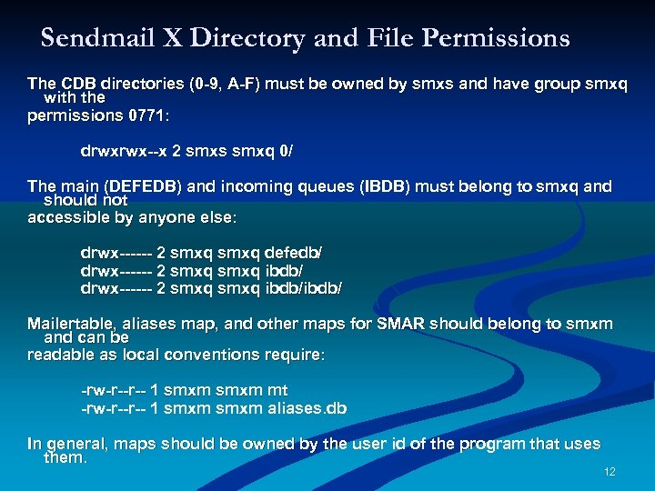 Sendmail X Directory and File Permissions The CDB directories (0 -9, A-F) must be owned by smxs and have group smxq with the permissions 0771: drwxrwx--x 2 smxs smxq 0/ The main (DEFEDB) and incoming queues (IBDB) must belong to smxq and should not accessible by anyone else: drwx------ 2 smxq defedb/ drwx------ 2 smxq ibdb/ibdb/ Mailertable, aliases map, and other maps for SMAR should belong to smxm and can be readable as local conventions require: -rw-r--r-- 1 smxm mt -rw-r--r-- 1 smxm aliases. db In general, maps should be owned by the user id of the program that uses them. 12