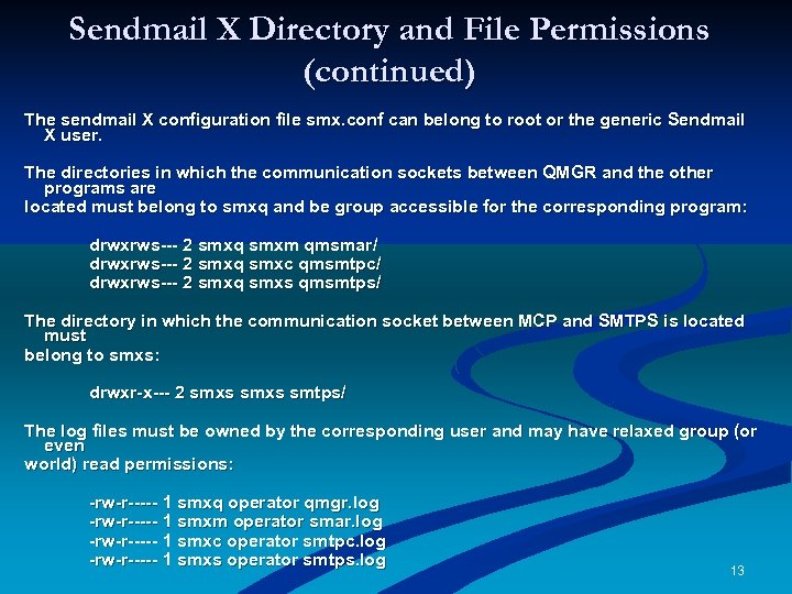 Sendmail X Directory and File Permissions (continued) The sendmail X configuration file smx. conf can belong to root or the generic Sendmail X user. The directories in which the communication sockets between QMGR and the other programs are located must belong to smxq and be group accessible for the corresponding program: drwxrws--- 2 smxq smxm qmsmar/ drwxrws--- 2 smxq smxc qmsmtpc/ drwxrws--- 2 smxq smxs qmsmtps/ The directory in which the communication socket between MCP and SMTPS is located must belong to smxs: drwxr-x--- 2 smxs smtps/ The log files must be owned by the corresponding user and may have relaxed group (or even world) read permissions: -rw-r----- 1 smxq operator qmgr. log -rw-r----- 1 smxm operator smar. log -rw-r----- 1 smxc operator smtpc. log -rw-r----- 1 smxs operator smtps. log 13