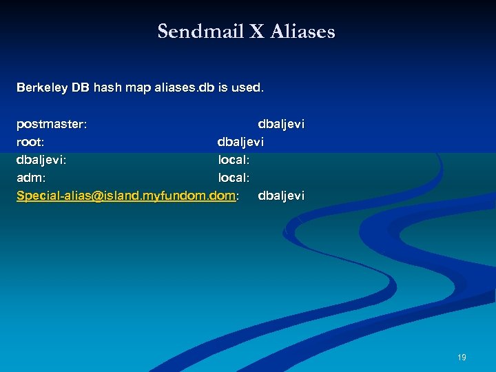 Sendmail X Aliases Berkeley DB hash map aliases. db is used. postmaster: dbaljevi root: dbaljevi: local: adm: local: Special-alias@island. myfundom. dom: dbaljevi 19