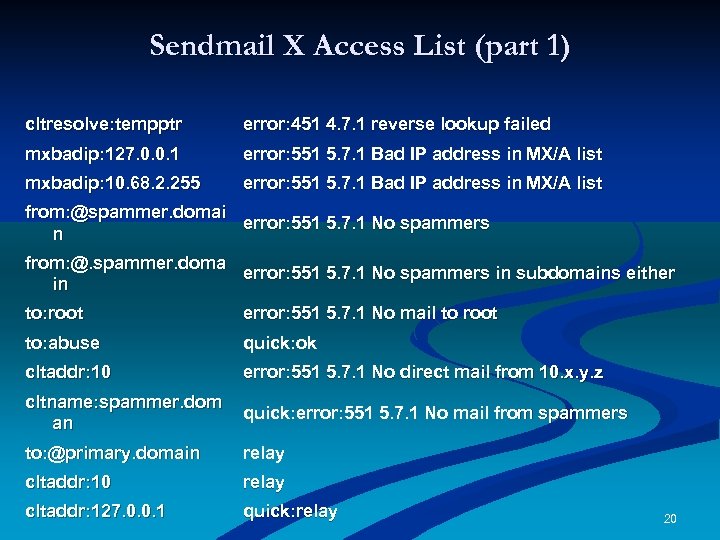 Sendmail X Access List (part 1) cltresolve: tempptr error: 451 4. 7. 1 reverse lookup failed mxbadip: 127. 0. 0. 1 error: 551 5. 7. 1 Bad IP address in MX/A list mxbadip: 10. 68. 2. 255 error: 551 5. 7. 1 Bad IP address in MX/A list from: @spammer. domai error: 551 5. 7. 1 No spammers n from: @. spammer. doma error: 551 5. 7. 1 No spammers in subdomains either in to: root error: 551 5. 7. 1 No mail to root to: abuse quick: ok cltaddr: 10 error: 551 5. 7. 1 No direct mail from 10. x. y. z cltname: spammer. dom an quick: error: 551 5. 7. 1 No mail from spammers to: @primary. domain relay cltaddr: 10 relay cltaddr: 127. 0. 0. 1 quick: relay 20