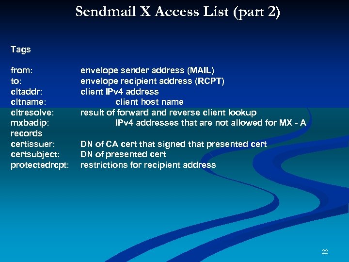 Sendmail X Access List (part 2) ( Tags from: to: cltaddr: cltname: cltresolve: mxbadip: records certissuer: certsubject: protectedrcpt: envelope sender address (MAIL) envelope recipient address (RCPT) client IPv 4 address client host name result of forward and reverse client lookup IPv 4 addresses that are not allowed for MX - A DN of CA cert that signed that presented cert DN of presented cert restrictions for recipient address 22