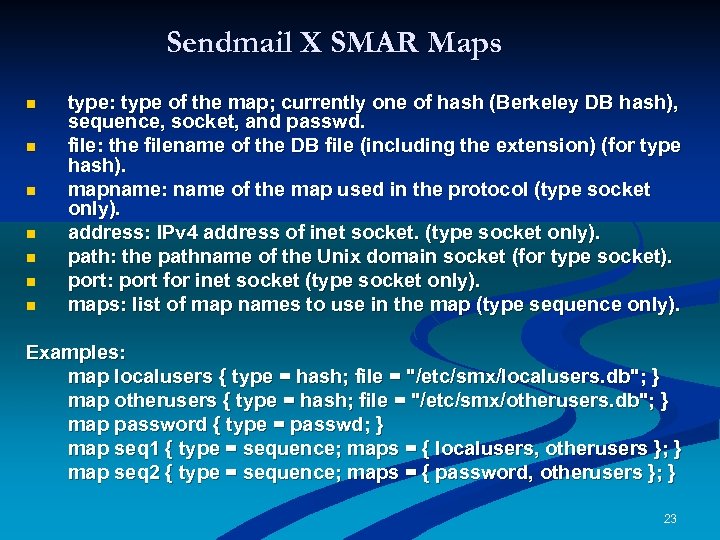 Sendmail X SMAR Maps n n n n type: type of the map; currently one of hash (Berkeley DB hash), sequence, socket, and passwd. file: the filename of the DB file (including the extension) (for type hash). mapname: name of the map used in the protocol (type socket only). address: IPv 4 address of inet socket. (type socket only). path: the pathname of the Unix domain socket (for type socket). port: port for inet socket (type socket only). maps: list of map names to use in the map (type sequence only). Examples: map localusers { type = hash; file = "/etc/smx/localusers. db"; } map otherusers { type = hash; file = "/etc/smx/otherusers. db"; } map password { type = passwd; } map seq 1 { type = sequence; maps = { localusers, otherusers }; } map seq 2 { type = sequence; maps = { password, otherusers }; } 23