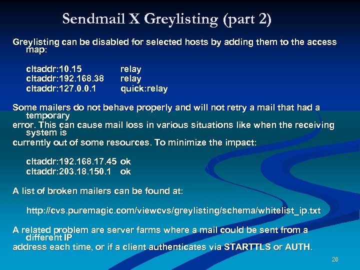Sendmail X Greylisting (part 2) Greylisting can be disabled for selected hosts by adding them to the access map: cltaddr: 10. 15 cltaddr: 192. 168. 38 cltaddr: 127. 0. 0. 1 relay quick: relay Some mailers do not behave properly and will not retry a mail that had a temporary error. This can cause mail loss in various situations like when the receiving system is currently out of some resources. To minimize the impact: cltaddr: 192. 168. 17. 45 ok cltaddr: 203. 18. 150. 1 ok A list of broken mailers can be found at: http: //cvs. puremagic. com/viewcvs/greylisting/schema/whitelist_ip. txt A related problem are server farms where a mail could be sent from a different IP address each time, or if a client authenticates via STARTTLS or AUTH. 26