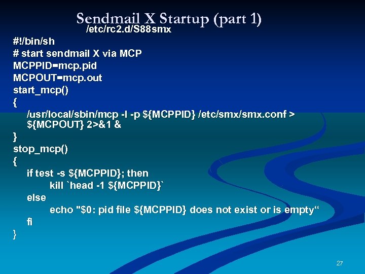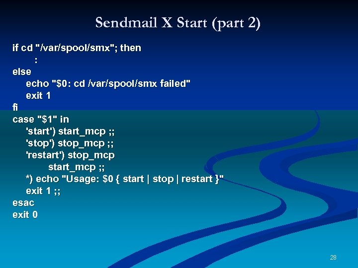 Sendmail X Startup (part 1) /etc/rc 2. d/S 88 smx #!/bin/sh # start sendmail X via MCPPID=mcp. pid MCPOUT=mcp. out start_mcp() { /usr/local/sbin/mcp -l -p ${MCPPID} /etc/smx. conf > ${MCPOUT} 2>&1 & } stop_mcp() { if test -s ${MCPPID}; then kill `head -1 ${MCPPID}` else echo "$0: pid file ${MCPPID} does not exist or is empty“ fi } 27