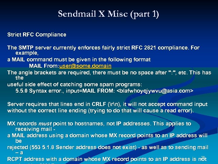 Sendmail X Misc (part 1) Strict RFC Compliance The SMTP server currently enforces fairly strict RFC 2821 compliance. For example, a MAIL command must be given in the following format MAIL From: user@some. domain The angle brackets are required, there must be no space after ": ", etc. This has the useful side effect of catching some spam programs: 5. 5. 0 Syntax error. , input=MAIL FROM:
