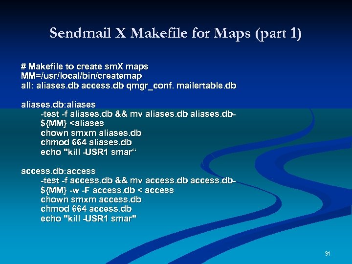 Sendmail X Makefile for Maps (part 1) # Makefile to create sm. X maps MM=/usr/local/bin/createmap all: aliases. db access. db qmgr_conf. mailertable. db aliases. db: aliases -test -f aliases. db && mv aliases. db ${MM}