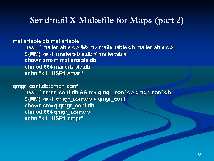 Sendmail X Makefile for Maps (part 2) mailertable. db: mailertable -test -f mailertable. db && mv mailertable. db ${MM} -w -F mailertable. db < mailertable chown smxm mailertable. db chmod 664 mailertable. db echo "kill -USR 1 smar" qmgr_conf. db: qmgr_conf -test -f qmgr_conf. db && mv qmgr_conf. db ${MM} -w -F qmgr_conf. db < qmgr_conf chown smxq qmgr_conf. db chmod 664 qmgr_conf. db echo "kill -USR 1 qmgr" 32