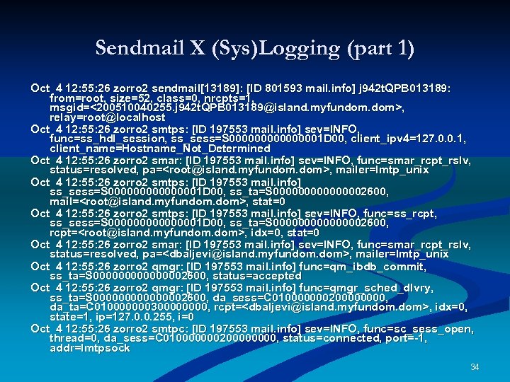Sendmail X (Sys)Logging (part 1) Oct 4 12: 55: 26 zorro 2 sendmail[13189]: [ID 801593 mail. info] j 942 t. QPB 013189: from=root, size=52, class=0, nrcpts=1, msgid=<200510040255. j 942 t. QPB 013189@island. myfundom. dom>, relay=root@localhost Oct 4 12: 55: 26 zorro 2 smtps: [ID 197553 mail. info] sev=INFO, func=ss_hdl_session, ss_sess=S 00000001 D 00, client_ipv 4=127. 0. 0. 1, client_name=Hostname_Not_Determined Oct 4 12: 55: 26 zorro 2 smar: [ID 197553 mail. info] sev=INFO, func=smar_rcpt_rslv, status=resolved, pa=