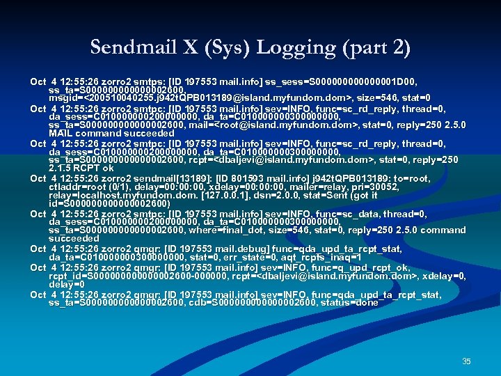 Sendmail X (Sys) Logging (part 2) Oct 4 12: 55: 26 zorro 2 smtps: [ID 197553 mail. info] ss_sess=S 00000001 D 00, ss_ta=S 00000002600, msgid=<200510040255. j 942 t. QPB 013189@island. myfundom. dom>, size=546, stat=0 Oct 4 12: 55: 26 zorro 2 smtpc: [ID 197553 mail. info] sev=INFO, func=sc_rd_reply, thread=0, da_sess=C 01000000020000, da_ta=C 01000000030000, ss_ta=S 00000002600, mail=
