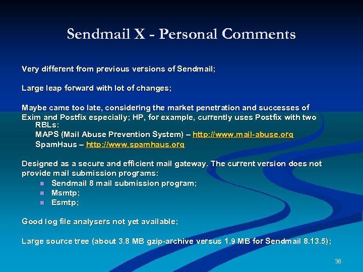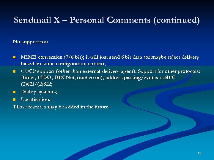 Sendmail X - Personal Comments Very different from previous versions of Sendmail; Large leap forward with lot of changes; Maybe came too late, considering the market penetration and successes of Exim and Postfix especially; HP, for example, currently uses Postfix with two RBLs: MAPS (Mail Abuse Prevention System) – http: //www. mail-abuse. org Spam. Haus – http: //www. spamhaus. org Designed as a secure and efficient mail gateway. The current version does not provide mail submission programs: n Sendmail 8 mail submission program; n Msmtp; n Esmtp; Good log file analysers not yet available; Large source tree (about 3. 8 MB gzip-archive versus 1. 9 MB for Sendmail 8. 13. 5); 36