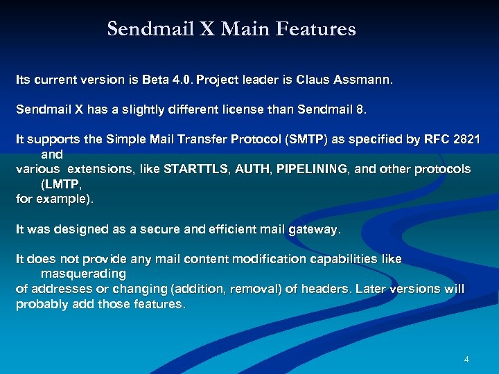 Sendmail X Main Features Its current version is Beta 4. 0. Project leader is Claus Assmann. Sendmail X has a slightly different license than Sendmail 8. It supports the Simple Mail Transfer Protocol (SMTP) as specified by RFC 2821 and various extensions, like STARTTLS, AUTH, PIPELINING, and other protocols (LMTP, for example). It was designed as a secure and efficient mail gateway. It does not provide any mail content modification capabilities like masquerading of addresses or changing (addition, removal) of headers. Later versions will probably add those features. 4