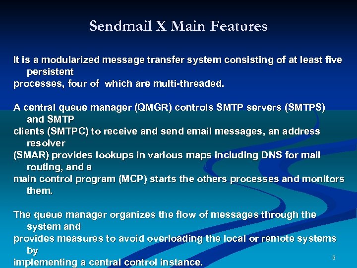 Sendmail X Main Features It is a modularized message transfer system consisting of at least five persistent processes, four of which are multi-threaded. A central queue manager (QMGR) controls SMTP servers (SMTPS) and SMTP clients (SMTPC) to receive and send email messages, an address resolver (SMAR) provides lookups in various maps including DNS for mail routing, and a main control program (MCP) starts the others processes and monitors them. The queue manager organizes the flow of messages through the system and provides measures to avoid overloading the local or remote systems by 5 implementing a central control instance.