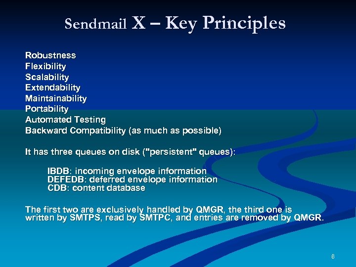 Sendmail X – Key Principles Robustness Flexibility Scalability Extendability Maintainability Portability Automated Testing Backward Compatibility (as much as possible) It has three queues on disk ("persistent" queues): IBDB: incoming envelope information DEFEDB: deferred envelope information CDB: content database The first two are exclusively handled by QMGR, the third one is written by SMTPS, read by SMTPC, and entries are removed by QMGR. 6
