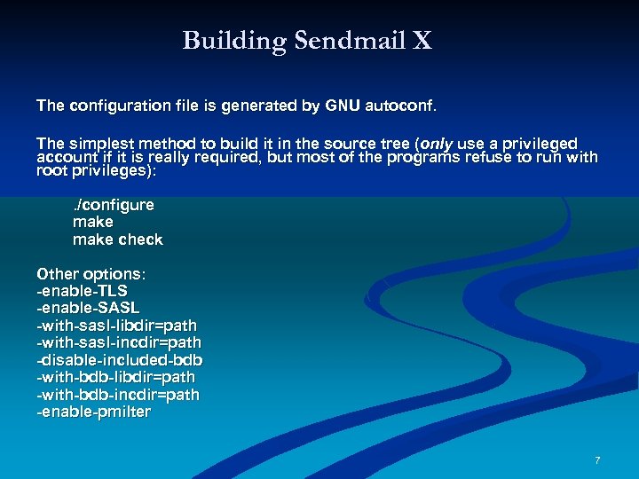 Building Sendmail X The configuration file is generated by GNU autoconf. The simplest method to build it in the source tree (only use a privileged account if it is really required, but most of the programs refuse to run with root privileges): . /configure make check Other options: -enable-TLS -enable-SASL -with-sasl-libdir=path -with-sasl-incdir=path -disable-included-bdb -with-bdb-libdir=path -with-bdb-incdir=path -enable-pmilter 7