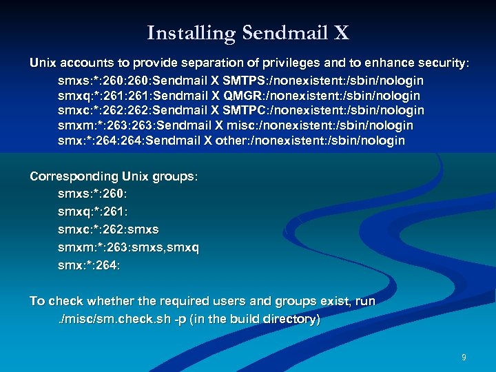 Installing Sendmail X Unix accounts to provide separation of privileges and to enhance security: smxs: *: 260: Sendmail X SMTPS: /nonexistent: /sbin/nologin smxq: *: 261: Sendmail X QMGR: /nonexistent: /sbin/nologin smxc: *: 262: Sendmail X SMTPC: /nonexistent: /sbin/nologin smxm: *: 263: Sendmail X misc: /nonexistent: /sbin/nologin smx: *: 264: Sendmail X other: /nonexistent: /sbin/nologin Corresponding Unix groups: smxs: *: 260: smxq: *: 261: smxc: *: 262: smxs smxm: *: 263: smxs, smxq smx: *: 264: To check whether the required users and groups exist, run . /misc/sm. check. sh -p (in the build directory) 9
