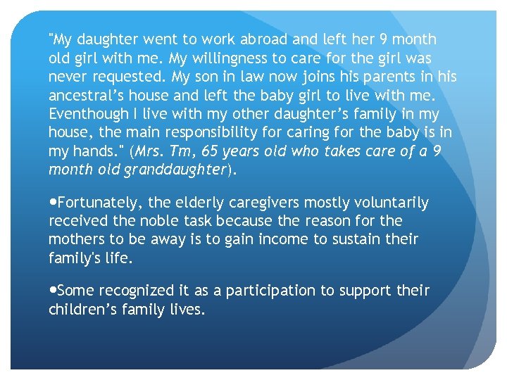 Problems that are faced by some elderly caregivers q Financial problems • Some elderly encounter financial problems who did not receive a sufficient amount of money to meet the grandchildren’s needs. • In some cases the amount of money they received from their migrant daughters was less than what they actually needed. • There are 2 reasons for not remit sufficient money home: 1. migrant workers kept the money and bring a big amount of them when the contract is over. 2. migrant workers were not paid by the employee monthly unable to remit on a monthly basis.