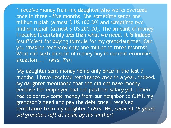 "I receive money from my daughter who works overseas once in three – five months. She sometime sends one million rupiah (almost $ US 100. 00) and sometime two million rupiah (almost $ US 200. 00). The amount of money I receive is certainly less than what we need. It is indeed insufficient for buying formula for my granddaughter. Can you imagine receiving only one million in three months? What can such amount of money buy in current economic situation. . . " (Mrs. Tm) "My daughter sent money home only once in the last 7 months. I have received remittance once in a year, indeed. My daughter mentioned that she did not have money because her employer had not paid her salary yet. I then had to borrow some money from our neighbor to fulfill my grandson’s need and pay the debt once I received remittance from my daughter. " (Mrs. Ws, carer of 15 years old grandson left at home by his mother)