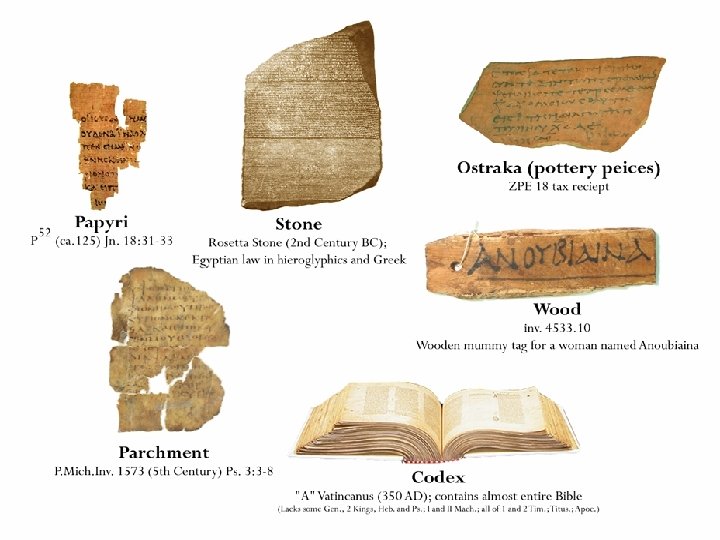 TRANSMISSION OF SCRIPTURE Basic facts of transmission: The most readily available writing materials were stone, papyri, and parchment (vellum) until the codex was developed in the 2 nd century B. C.