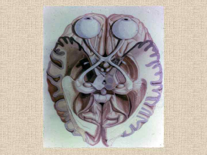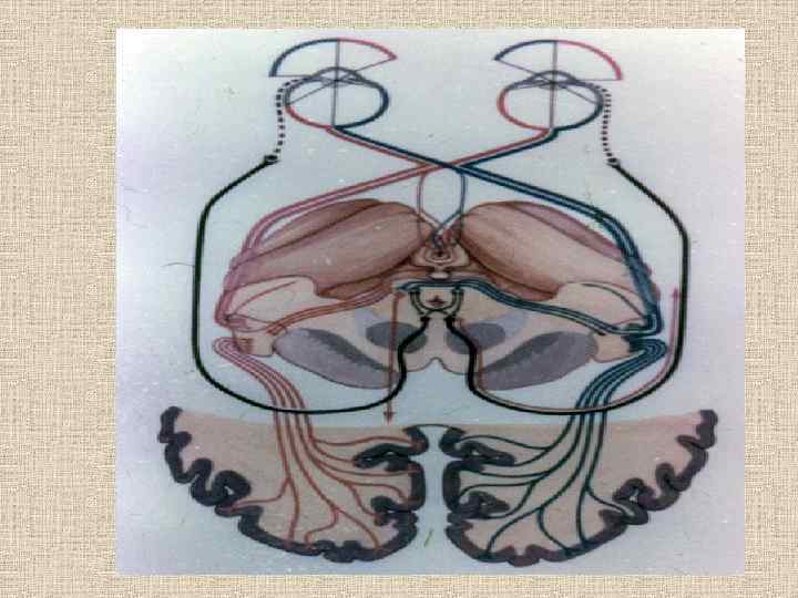 Анализатор зрения Зрительный анализатор по тонкости строения и функциональному совершенству занимает особенное место. Сетчатка- имеет три рецепторных слоя. Первый – палочки и колбочки. Второй – биполярные клетки, третий – ганглиозный. Центральные отростки последнего, проходя через сосочек зрительного нерва, формируют этот нерв. Нерв входит в череп, подходит к основанию мозга и впереди серого бугра своими внутренними, начинающимися от носовой половины сетчатки, образуют перекрест (хиазму). После этого неполного перекреста зрительные волокна называются зрительным трактом. Каждый зрительный тракт содержит в себе волокна из одноименных половин сетчатки. . Следовательно, при поражении зрительного тракта будет выявляться функциональное выпадение половины сетчаток обоих глаз (гемианопсия).