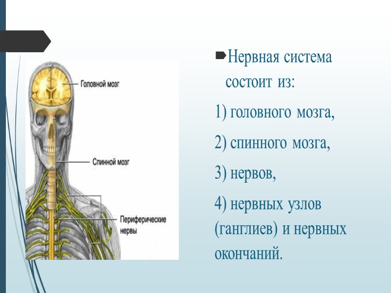 Нервная система состоит из: 1) головного мозга, 2) спинного мозга, 3) нервов, 4) нервных узлов (ганглиев) и нервных окончаний.