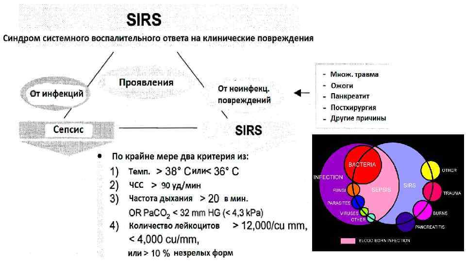 Международная терминология и классификация сепсиса (конценсус Американских колледжа пульмонологов и общества специалистов критической медицины, 1992 г. ) • Бактериемия – наличие жизнеспособный бактерий в крови (положительная гемокультура) • Синдром системного воспалительного ответа на воспаление (ССВО, SIRS) - наличие 2 и более критериев: • • • температура тела >38°С или <36°С; ЧСС >100 уд. в 1 мин; ЧДД >20 дыханий в 1 мин или Pa. CO 2 <32 мм рт. ст. ; число лейкоцитов >12· 109/л или <4· 109/л; наличие незрелых (ю, п/я) форм >10%. • Сепсис = ССВО + доказательства инфекции (устойчивая бактериемия и/или несанированный обширный очаг воспаления и/или устойчивые лабораторные признаки инфекции при исключении неинфекционных процессов)