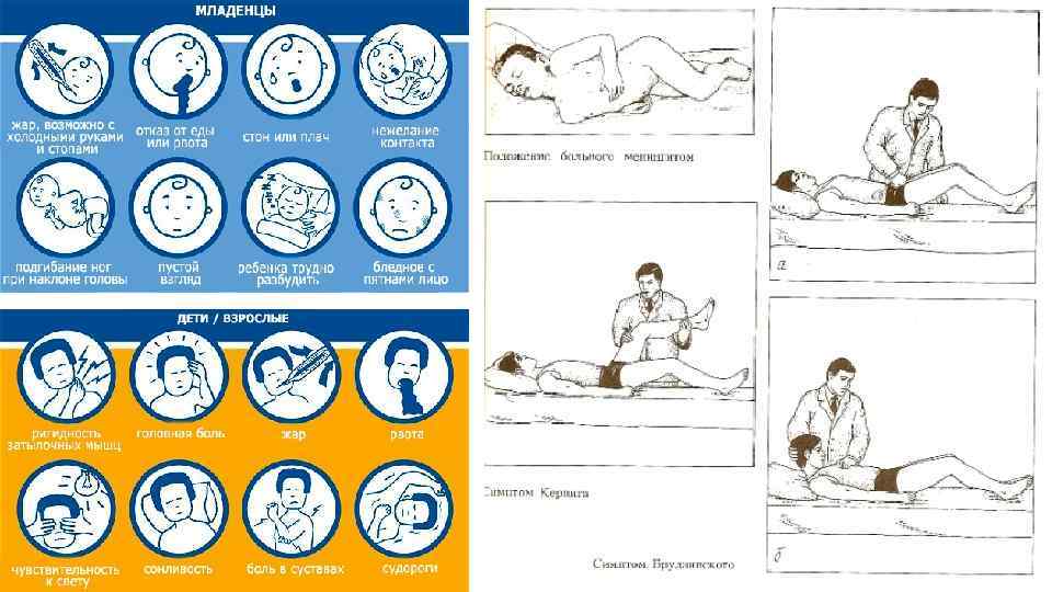 Менингеальный синдром • • • Фотобоязнь Ригидность шейных мышц Симптом Кернига Симптомы Брудзинского (верхний, средний и нижний) Для детей – «симптом подвешивания» (первый год жизни), «симптом треножника» (более старший возраст)