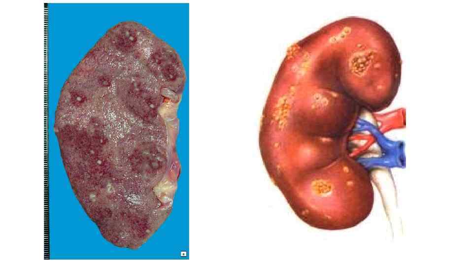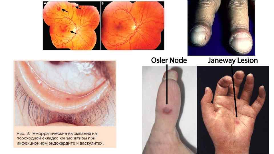 Клинико-морфологические проявления и осложнения ИЭ - 2 Иммунные и воспалительные реакции: Примечание: иммунокомплексные механизмы характерны только для подострого и затяжного ИЭ • Васкулиты (в т. ч. с фибриноидными изменениями), результатами которых являются: • Снижение механической прочности: формирование аневризм, разрывы сосудов • Повышение сосудистой проницаемости: отек, множественные петехиальные кровоизлияния (в т. ч. пятна Лукина-Либмана, Дженуэя, Рота), положительные симптомы жгута и щипка, при гломерулонефритах – гематурия, протеинурия, гипертензия • Формирование воспалительной инфильтрации вокруг участков некроза (например, узелки Ослера) • Межуточное воспаление внутренних органов, в т. ч. иммунокомплексного генеза (сочетание гепатита и анемии у таких больных придает окрас кожи «кофе с молоком» ) • Гиперплазия органов кроветворения (селезенка – гиперплазия, множественные инфаркты) • Лихорадка, интоксикационный синдром • При затяжном и хроническом течении развитие АА-амилоидоза
