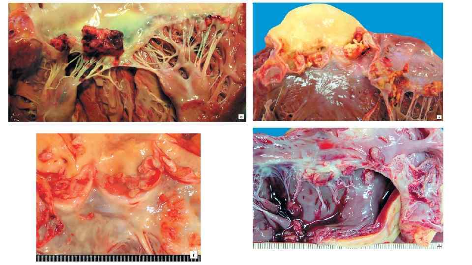 Этиология и патогенез инфекционного эндокардита (ИЭ) - 2 • Септическое воспаление клапанного аппарата приводит: • К снижению механической прочности аппарата (разрывы хорд, пролабирование створок, появление отверстий), результат – регургитация крови, недостаточность клапана (наиболее характерна для ИЭ), формирование перегрузочной формы сердечной недостаточности • К повреждению эндотелия (изъязвление) и формированию вегетаций (пристеночные тромбы с колониями микроорганизмов, не путать с бородавками при ревматических заболеваниях!!!), результат – тромбоэмболический синдром (септические эмболы по малому/большому/сердечному кругам), при массивных вегетациях – стеноз отверстия клапана • Выраженные иммунопатологические реакции и воспалительный ответ также связан с циркуляцией иммунных комплексов (иммунопатологические реакции отсутствует при остром ИЭ, т. к. антитела еще не успевают выработаться)
