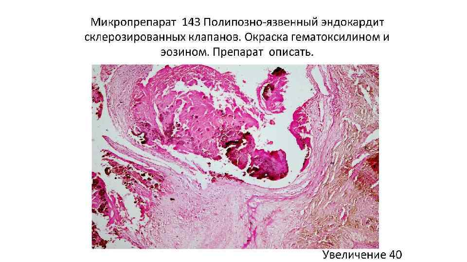 Полипозно-язвенный эндокардит при подостром и затяжном ИЭ (П/Я эндокардит склерозированных клапанов). Морфология • В результате попадания микроба в эндокарде формируется очаг фибриноидного некроза (иногда видны колонии микробов), который приводит к изъязвлению, образованию тромботических вегетаций и вызывает воспаление в окружающих тканях (лимфомакрофагальная инфильтрация с незначительной примесью нейтрофилов) • Склеротические процессы в клапанном аппарате: • Склероз может уже быть как результат предшествующего воспалительного процесса (например, ревматического) – тогда при ИЭ к старой соединительной ткани добавится свежая грануляционная ткань, потом склероз усилится либо • Склероз сформируется в исходе самого эндокардита (при болезни Черногубова). В этом случае соединительная ткань в клапане будет отсутствовать только при остром иэ. • Также для ИЭ характерен кальциноз