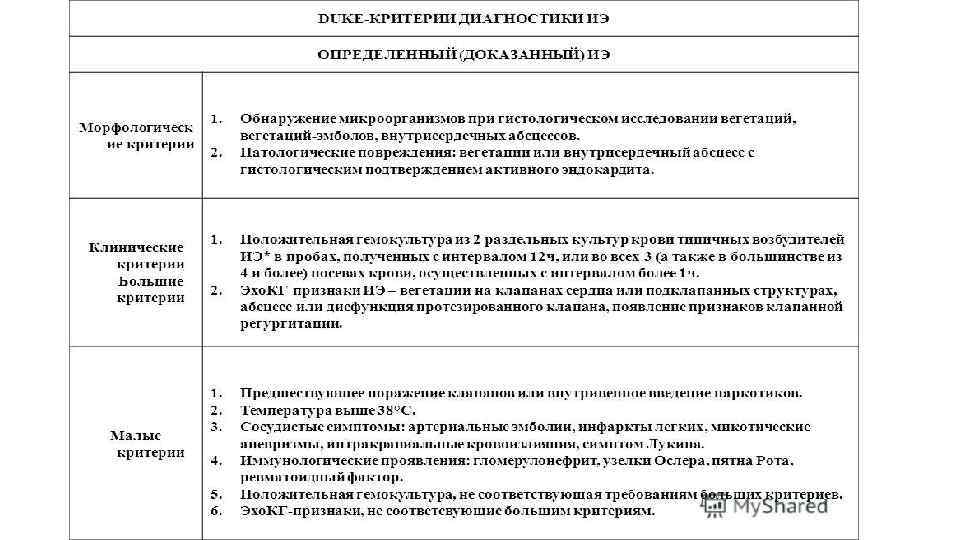 Инфекционный (септический, бактериальный) эндокардит. Классификация По локализации септического очага на клапанном аппарате • Клапаннный • Хордальный • Пристеночный По отношению к предсуществующей патологии клапанного аппарата (на интактный клапан микробу труднее прикрепиться): • Первичный – интактные клапаны – болезнь Черногубова • Вторичный – на фоне порока клапана/протезирования • Инфекционный эндокардит протезированного клапана: ранний (до года после операции), поздний (через год после оерации) По длительности заболевания: • Острый (до 2 нед) – преобладает гнойное воспаление и признаки гиперэргии, порой, сходные с септицемией • Подострый (2 нед – 3 мес) – гнойное воспаление нехарактерно, происходит формирование антител и ЦИК • Затяжной (более 3 мес до нескольких лет) – то же + признаки хронического воспалительного процесса По степени активности инфекционно-воспалительного и деструктивного процессов