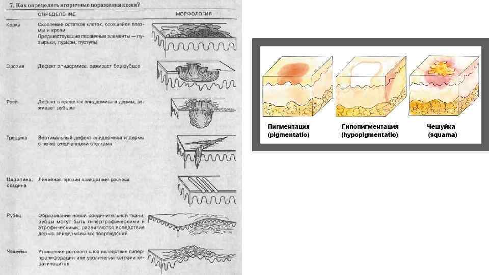 Вторичные элементы кожной сыпи Образуются из первичных в результате их дальнейшего развития: • • • Гипо- и гиперпигментация Трещина Экскориация Эрозия Язва Чешуйка Корка Рубец Лихенификация Вегетация