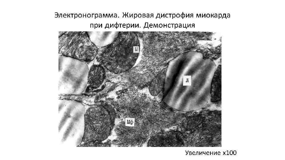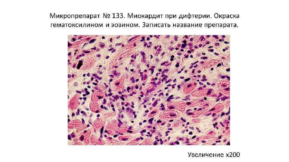 Основные органы-мишени • Эндотелий стенки сосудов: повышение проницаемости, отек жировой клетчатки головы и шеи, геморрагический синдром, развитие инфекционно-токсического шока • Миокард: 1) повреждение лизосом, высвобождение лизосомальных ферментов; 2) повреждение митохондрий, блокада L-карнитина, нарушение бета-окисления жирных кислот, гипоксия, жировая дистрофия. Все это приводит к альтеративному миокардиту и раннему параличу сердца как его проявлению (1 -2 неделя от начала заболевания). • Нервные волокна. Процессы демиелинизации. Развитие паренхиматозного неврита и, при поражении n. vagus и внутрисердечных ганглиев, позднего паралича сердца. Также развитие вялых парезов и параличей, атрофия мышц. • Почки: развитие некротического нефроза, острой почечной недостаточности. • Надпочечники: нарушение синтеза гормонов коры надпочечники, реже – двустороннее кровоизлияние в надпочечники (синдром Уотерхауза. Фридериксена)