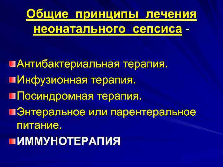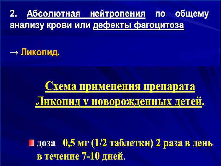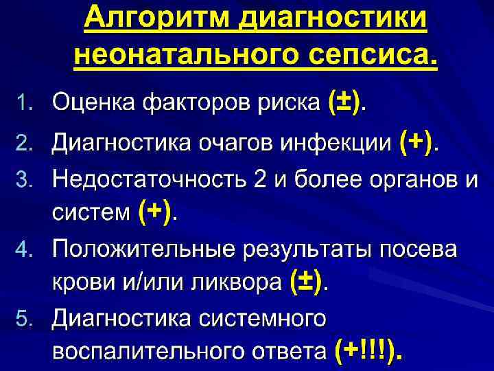 Схемы антибактериальной терапии при высоком риске развития неонатального сепсиса Стартовая терапия Цефалоспорин 3 -го поколения + аминогликозид; карбапенем (монотерапия) Терапия резерва (или после уточнения возбудителя) Цефалоспорин 4 -го поколения (цефепим) + резервный аминогликозид (амикацин); ванкомицин (монотерапия); защищенные пенициллины + аминогликозид Антибиотики Имипинем/циластатин; линезолид (при MRSглубокого инфекции) резерва Терапия по жизненным показаниям Фторхинолон (ципрофлоксацин)
