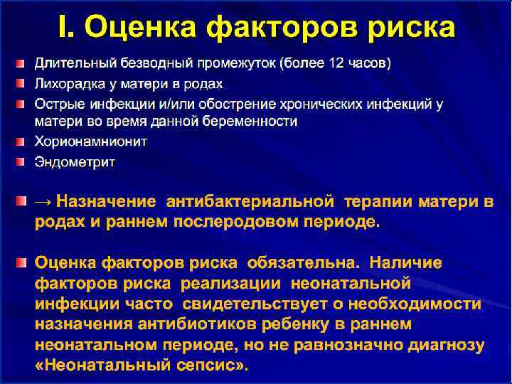 Факторы высокого риска бактериального инфицирования плода и новорожденного Инфекционно-воспалительные заболевания у беременной (пиелонефрит, аднексит, кольпит). Инфекции у родильницы (эндометрит, мастит). Безводный период в родах > 6 часов. Признаки инфицирования амниона ( «грязные» воды, наложения на плаценте). Внебольничные роды.