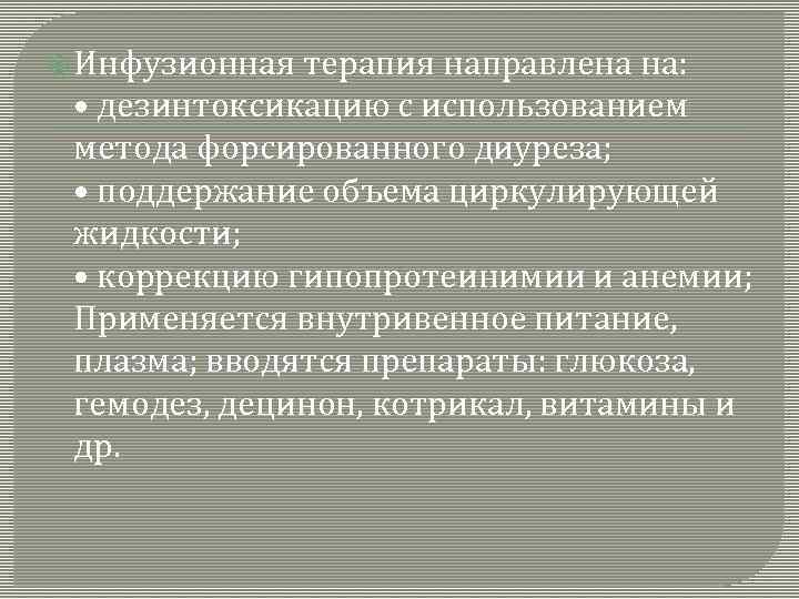 Инфузионная терапия направлена на: • дезинтоксикацию с использованием метода форсированного диуреза; • поддержание объема циркулирующей жидкости; • коррекцию гипопротеинимии и анемии; Применяется внутривенное питание, плазма; вводятся препараты: глюкоза, гемодез, децинон, котрикал, витамины и др.