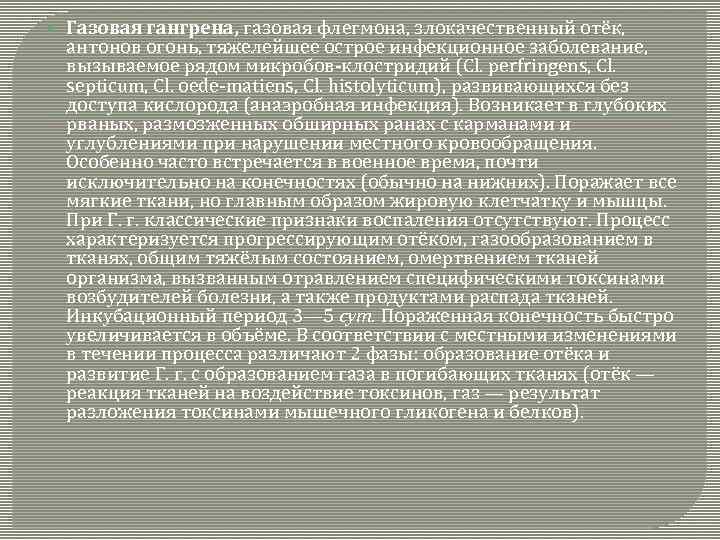 Газовая гангрена, газовая флегмона, злокачественный отёк, антонов огонь, тяжелейшее острое инфекционное заболевание, вызываемое рядом микробов-клостридий (Cl. perfringens, Cl. septicum, Cl. oede-matiens, Cl. histolyticum), развивающихся без доступа кислорода (анаэробная инфекция). Возникает в глубоких рваных, размозженных обширных ранах с карманами и углублениями при нарушении местного кровообращения. Особенно часто встречается в военное время, почти исключительно на конечностях (обычно на нижних). Поражает все мягкие ткани, но главным образом жировую клетчатку и мышцы. При Г. г. классические признаки воспаления отсутствуют. Процесс характеризуется прогрессирующим отёком, газообразованием в тканях, общим тяжёлым состоянием, омертвением тканей организма, вызванным отравлением специфическими токсинами возбудителей болезни, а также продуктами распада тканей. Инкубационный период 3— 5 сут. Пораженная конечность быстро увеличивается в объёме. В соответствии с местными изменениями в течении процесса различают 2 фазы: образование отёка и развитие Г. г. с образованием газа в погибающих тканях (отёк — реакция тканей на воздействие токсинов, газ — результат разложения токсинами мышечного гликогена и белков).