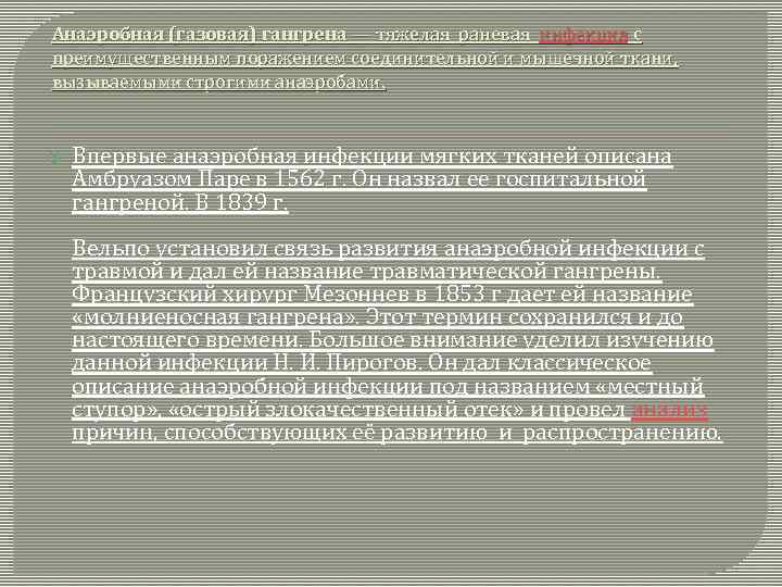 Анаэробная (газовая) гангрена — тяжелая раневая инфекция с преимущественным поражением соединительной и мышечной ткани, вызываемыми строгими анаэробами. Впервые анаэробная инфекции мягких тканей описана Амбруазом Паре в 1562 г. Он назвал ее госпитальной гангреной. В 1839 г. Вельпо установил связь развития анаэробной инфекции с травмой и дал ей название травматической гангрены. Французский хирург Мезоннев в 1853 г дает ей название «молниеносная гангрена» . Этот термин сохранился и до настоящего времени. Большое внимание уделил изучению данной инфекции Н. И. Пирогов. Он дал классическое описание анаэробной инфекции под названием «местный ступор» , «острый злокачественный отек» и провел анализ причин, способствующих её развитию и распространению.