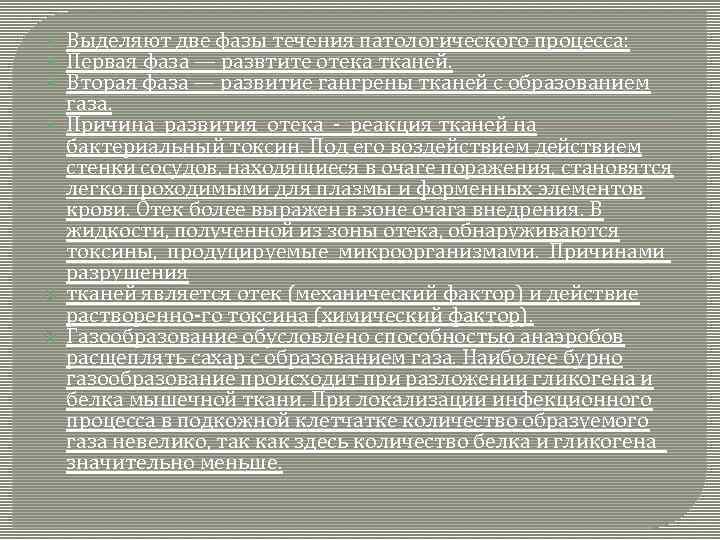 Выделяют две фазы течения патологического процесса: Первая фаза — развтите отека тканей. Вторая фаза — развитие гангрены тканей с образованием газа. Причина развития отека - реакция тканей на бактериальный токсин. Под его воздействием стенки сосудов, находящиеся в очаге поражения, становятся легко проходимыми для плазмы и форменных элементов крови. Отек более выражен в зоне очага внедрения. В жидкости, полученной из зоны отека, обнаруживаются токсины, продуцируемые микроорганизмами. Причинами разрушения тканей является отек (механический фактор) и действие растворенно-го токсина (химический фактор). Газообразование обусловлено способностью анаэробов расщеплять сахар с образованием газа. Наиболее бурно газообразование происходит при разложении гликогена и белка мышечной ткани. При локализации инфекционного процесса в подкожной клетчатке количество образуемого газа невелико, так как здесь количество белка и гликогена значительно меньше.