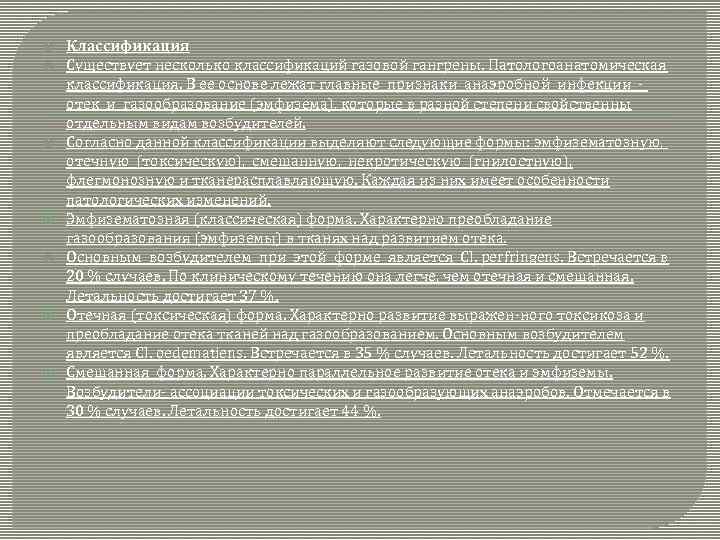 Классификация Существует несколько классификаций газовой гангрены. Патологоанатомическая классификация. В ее основе лежат главные признаки анаэробной инфекции - отек и газообразование (эмфизема), которые в разной степени свойственны отдельным видам возбудителей. Согласно данной классификации выделяют следующие формы: эмфизематозную, отечную (токсическую), смешанную, некротическую (гнилостную), флегмонозную и тканерасплавляющую. Каждая из них имеет особенности патологических изменений. Эмфизематозная (классическая) форма. Характерно преобладание газообразования (эмфиземы) в тканях над развитием отека. Основным возбудителем при этой форме является Cl. perfringens. Встречается в 20 % случаев. По клиническому течению она легче, чем отечная и смешанная. Летальность достигает 37 %. Отечная (токсическая) форма. Характерно развитие выражен-ного токсикоза и преобладание отека тканей над газообразованием. Основным возбудителем является Cl. oedematiens. Встречается в 35 % случаев. Летальность достигает 52 %. Смешанная форма. Характерно параллельное развитие отека и эмфиземы. Возбудители- ассоциации токсических и газообразующих анаэробов. Отмечается в 30 % случаев. Летальность достигает 44 %.