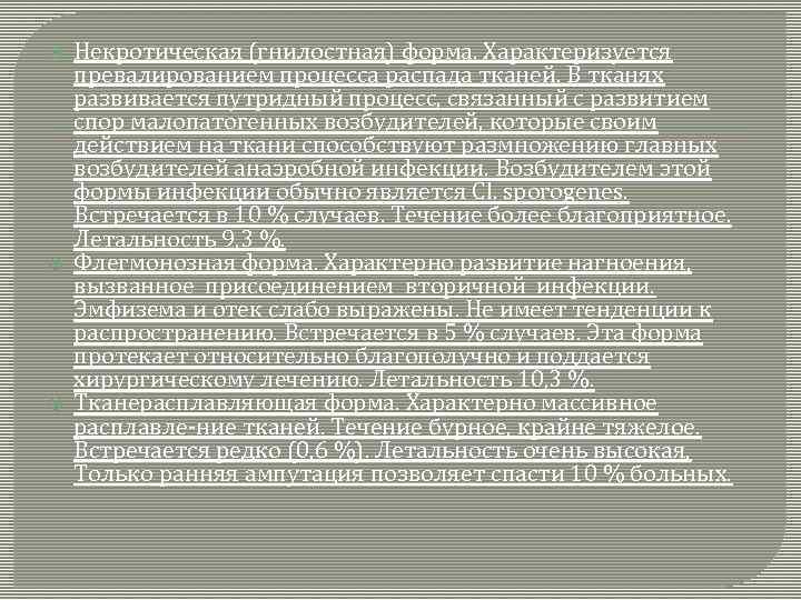 Некротическая (гнилостная) форма. Характеризуется превалированием процесса распада тканей. В тканях развивается путридный процесс, связанный с развитием спор малопатогенных возбудителей, которые своим действием на ткани способствуют размножению главных возбудителей анаэробной инфекции. Возбудителем этой формы инфекции обычно является Cl. sporogenes. Встречается в 10 % случаев. Течение более благоприятное. Летальность 9, 3 %. Флегмонозная форма. Характерно развитие нагноения, вызванное присоединением вторичной инфекции. Эмфизема и отек слабо выражены. Не имеет тенденции к распространению. Встречается в 5 % случаев. Эта форма протекает относительно благополучно и поддается хирургическому лечению. Летальность 10, 3 %. Тканерасплавляющая форма. Характерно массивное расплавле-ние тканей. Течение бурное, крайне тяжелое. Встречается редко (0, 6 %). Летальность очень высокая, Только ранняя ампутация позволяет спасти 10 % больных.